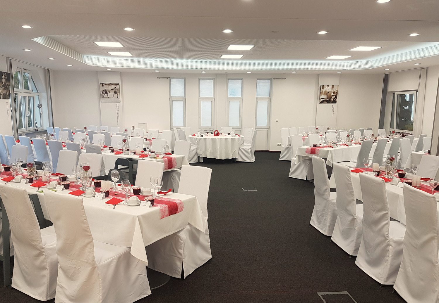 Ob klassisch in Weiß, elegant mit Farbakzenten oder modern inszeniert: Wir gestalten Ihre Hochzeitslocation ganz nach Ihren Wünschen. Liebevoll eingedeckte Tafeln, stimmungsvolle Beleuchtung und charmante Details sorgen für eine Atmosphäre, die Ihren Tag unvergesslich macht.