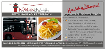 Das Aalener Römerhotel & Restaurant Adler liegt ideal für Busreisen: verkehrsgünstig direkt an der B29 und nur ca. 10 Minuten von der A7 entfernt. So erreichen Sie uns schnell und völlig ohne Umwege.